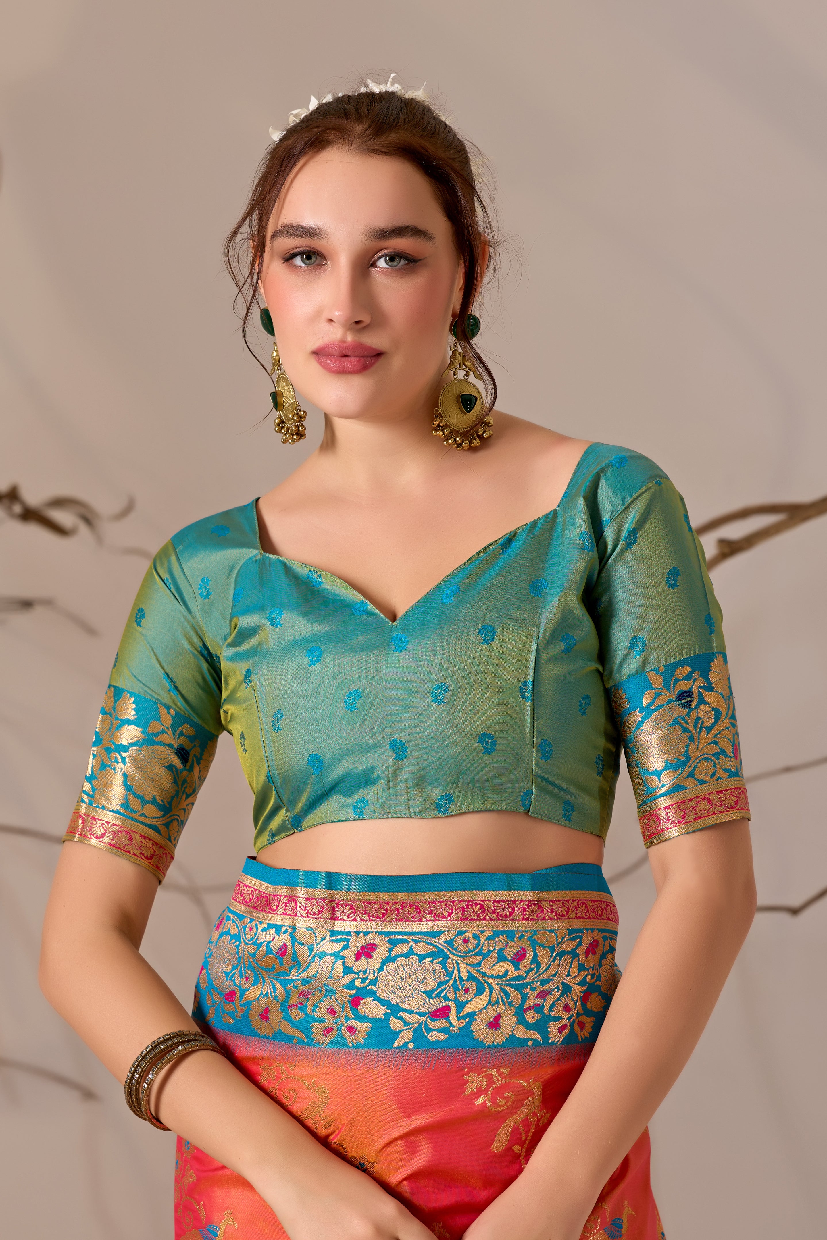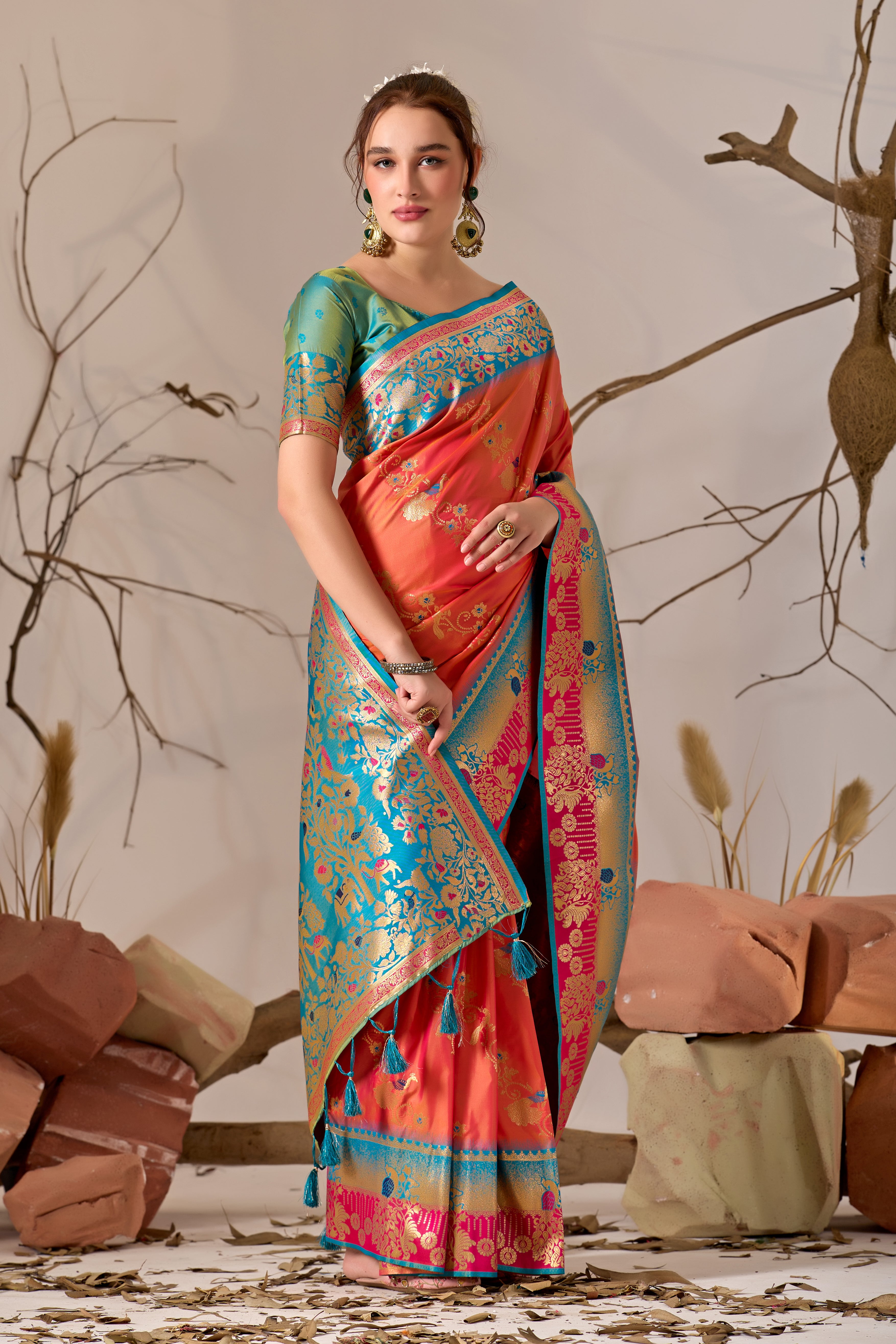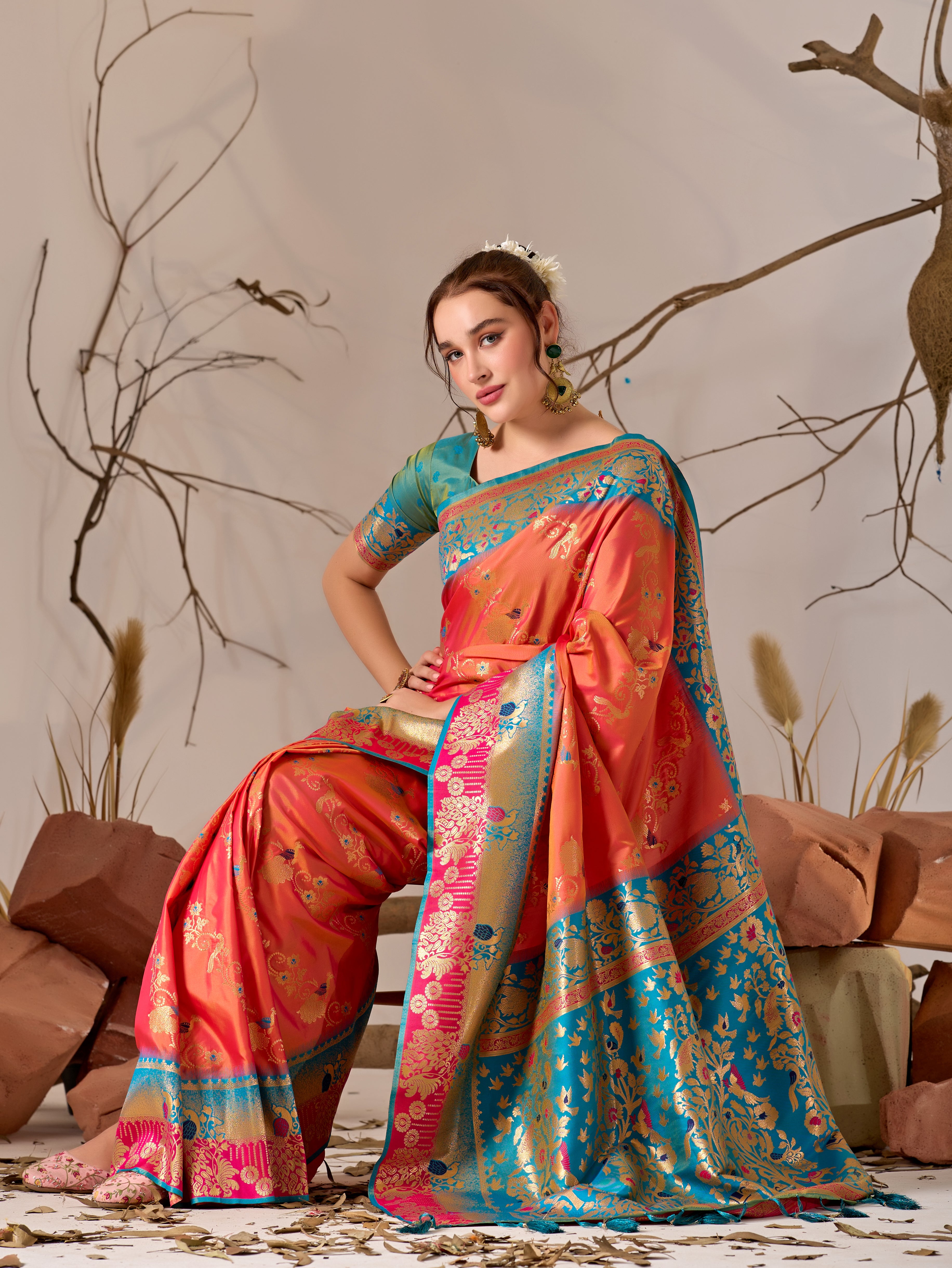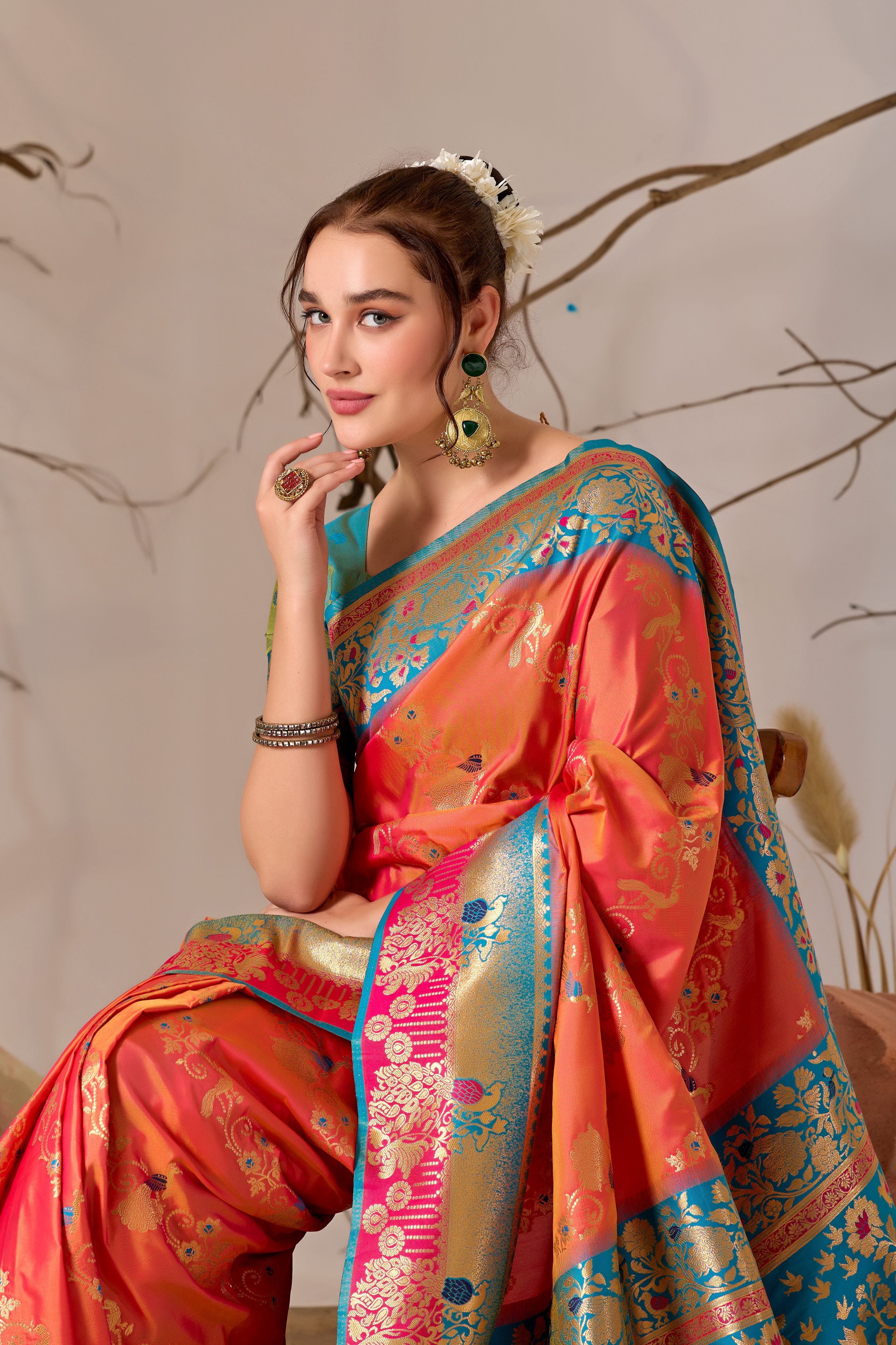 • Banarasi Silk Saree with Peacock & Parrot Motifs in Firoji