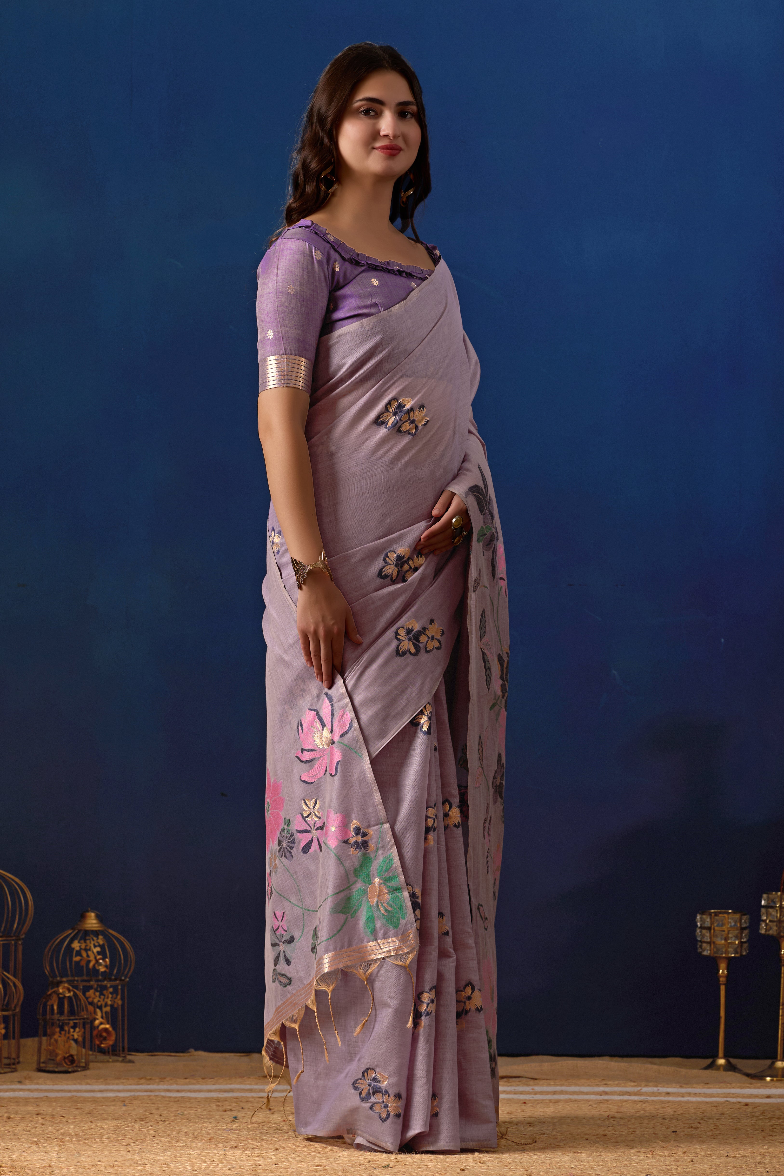 Embrace sophistication and grace with this stunning Muga Cotton Silk Saree in a soothing lavender tone, crafted to perfection with rich floral artistry. The saree features intricate woven floral and butterfly motifs across the body, highlighted with subtle zari detailing that adds a touch of shimmer to its refined texture. The soft muga cotton silk fabric offers a luxurious drape, making it lightweight yet elegant for festive and semi-formal occasions. The pallu showcases a mesmerizing blend of floral vines and delicate zari accents, enhancing its overall charm. Paired with a majanta (magenta) contrast blouse, this saree radiates timeless elegance with a modern touch.