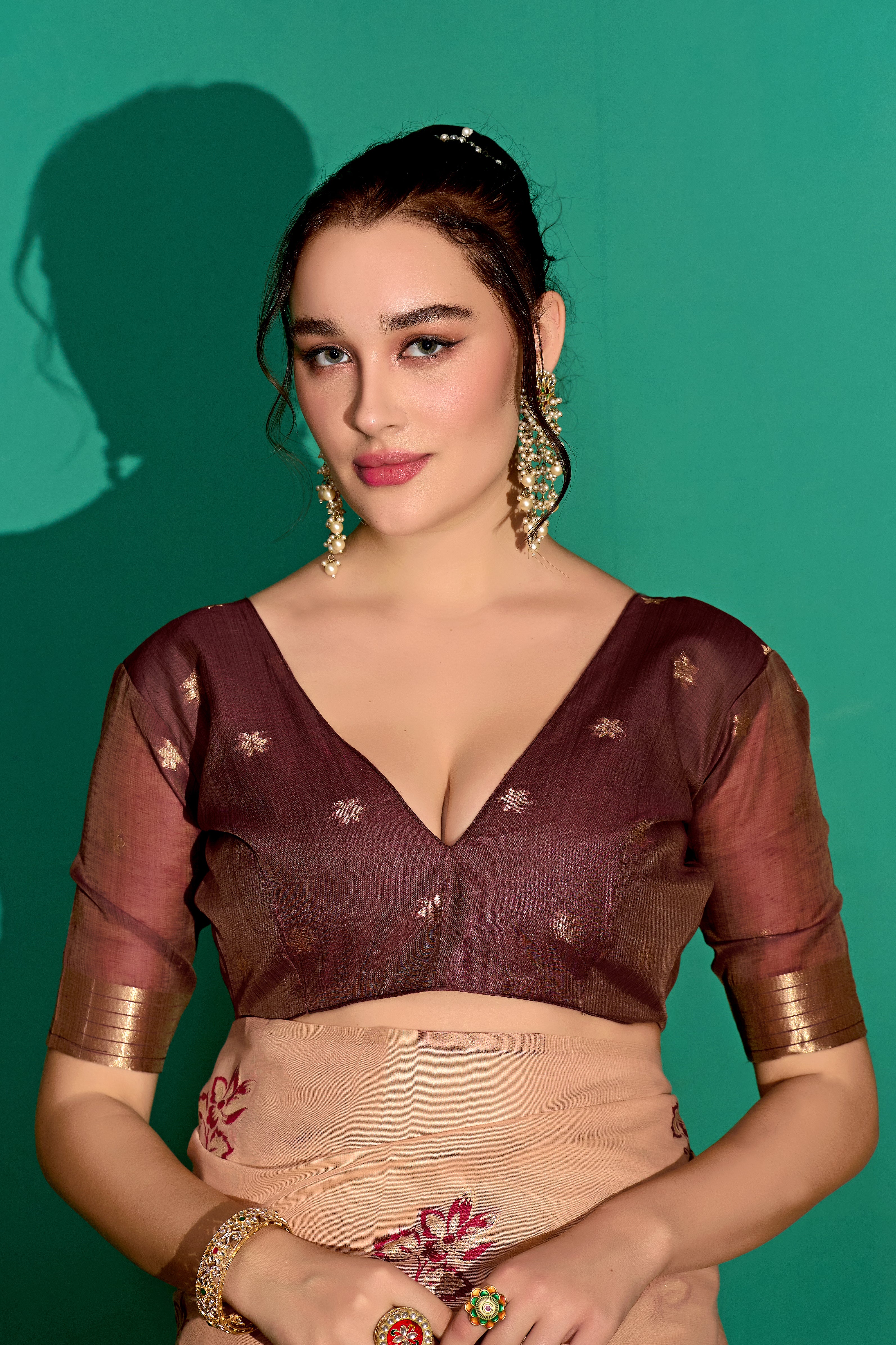 Grace your wardrobe with the charm of tradition and elegance in this Woven Muga Cotton Saree. Featuring a refined peach base adorned with intricate floral woven motifs, this saree beautifully blends timeless craftsmanship with modern grace. The contrast maroon blouse enhances its sophistication, making it perfect for festive occasions, cultural gatherings, or elegant day events. Crafted from premium cotton, it offers both comfort and style, draping effortlessly for a graceful look.