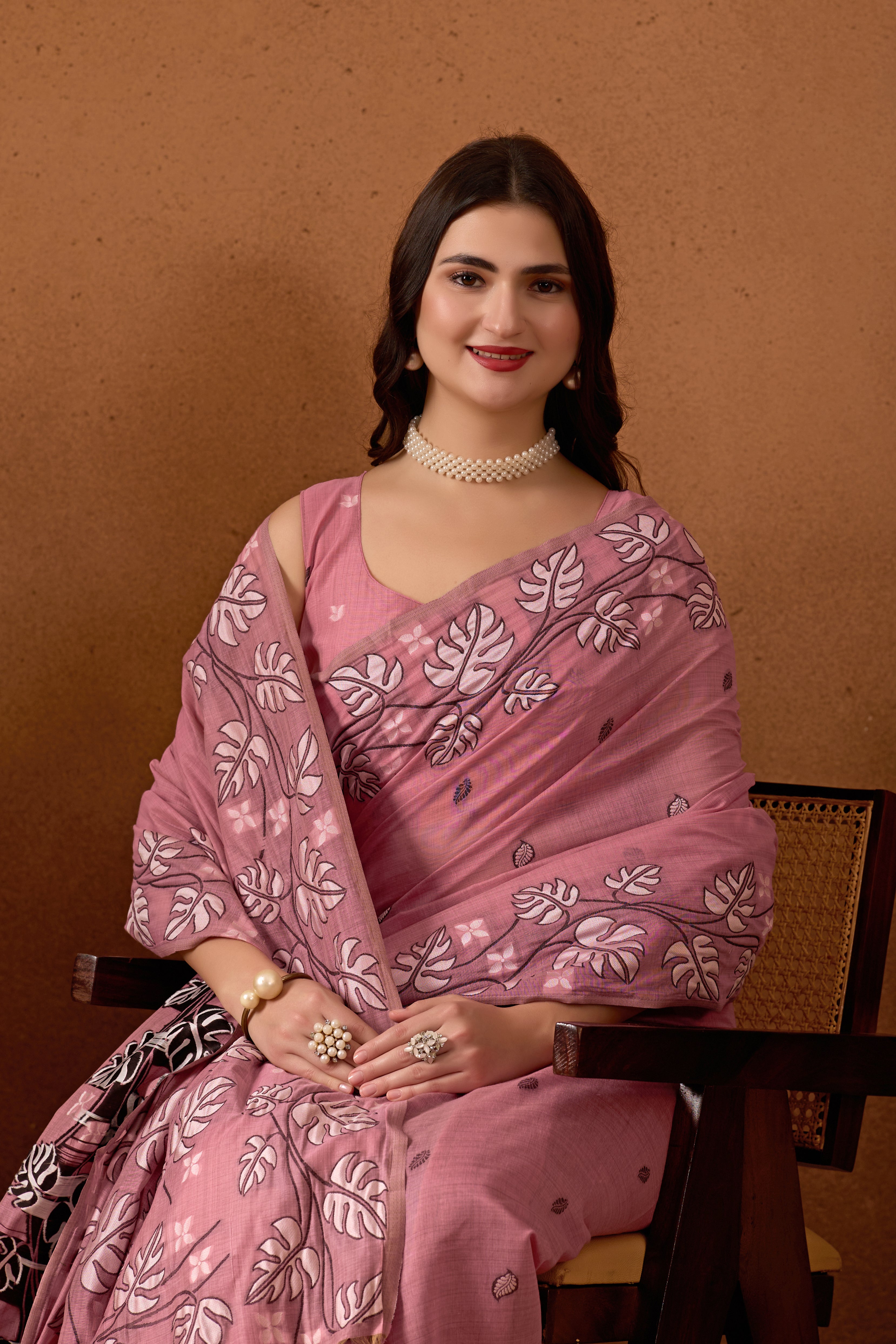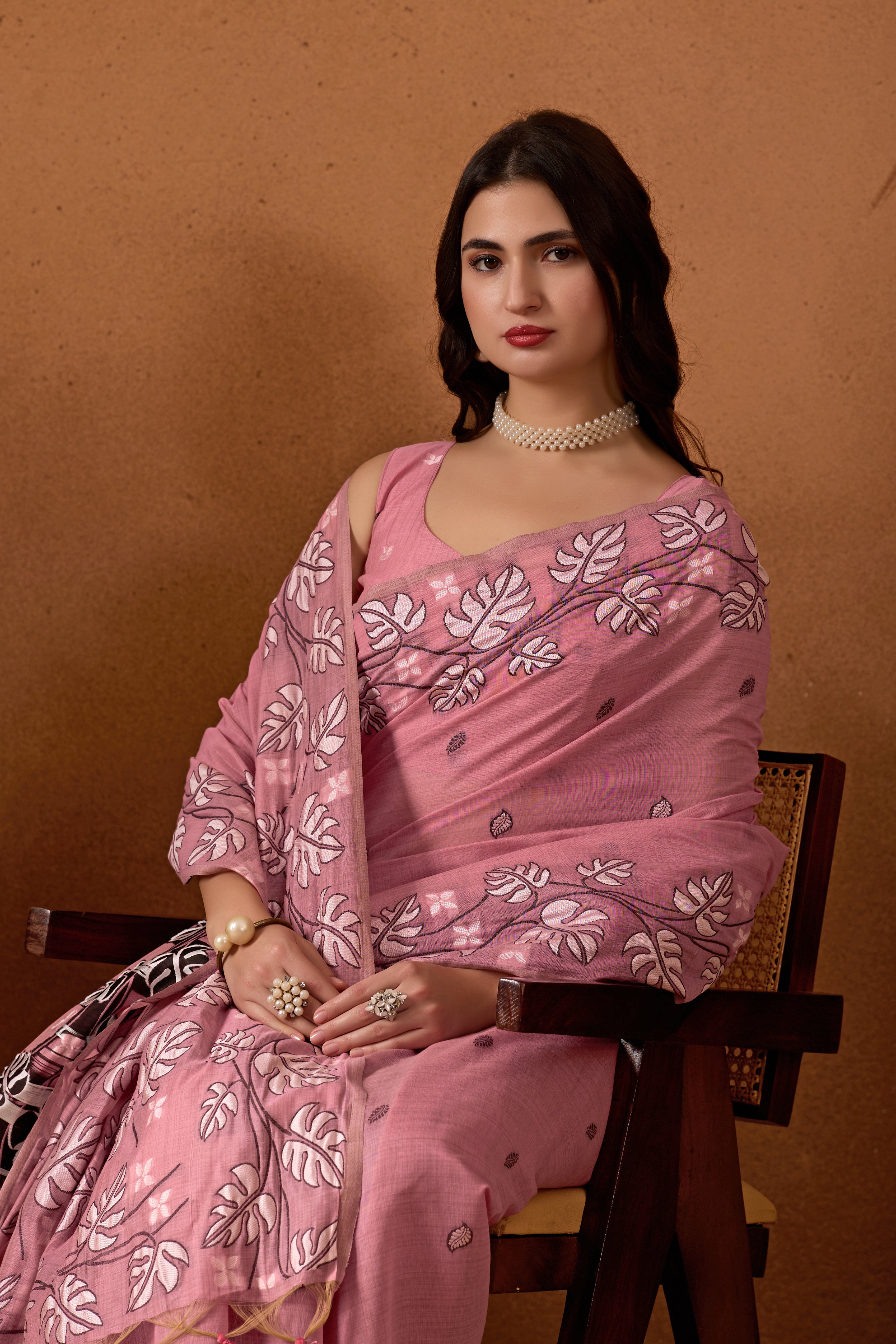 Leaf Harmony Chanderi Cotton Saree in Pink