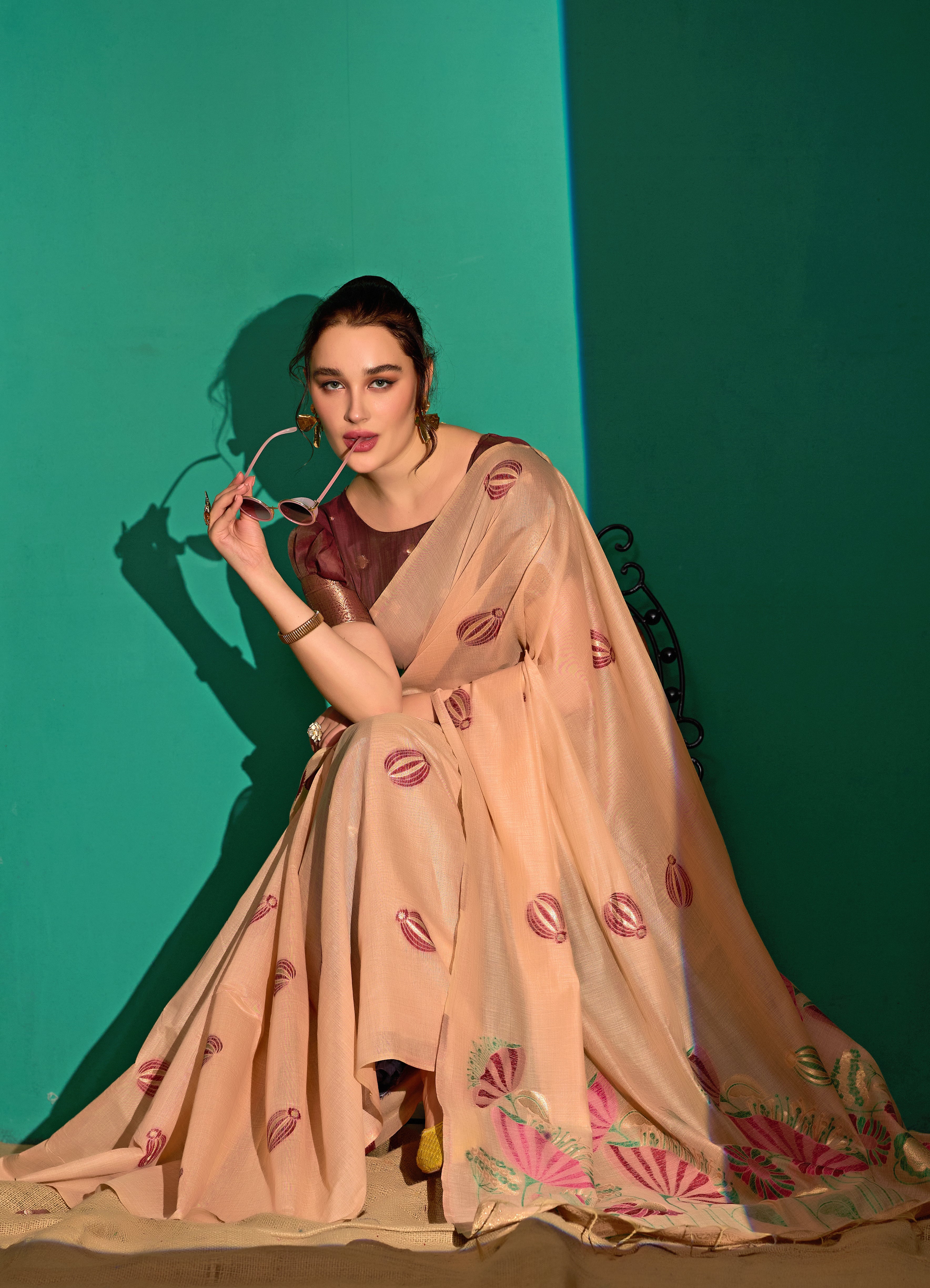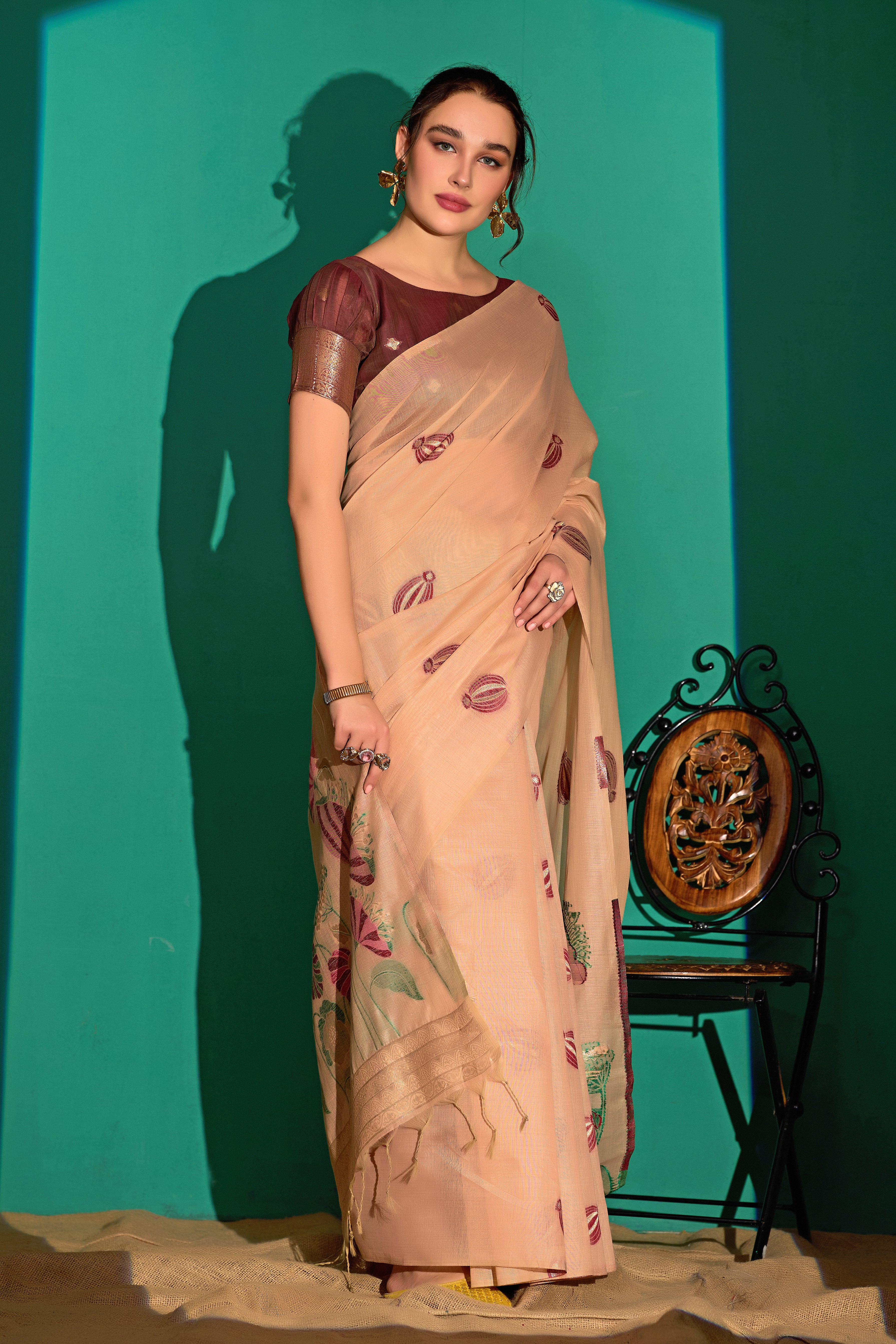 Lotus Bloom Woven Muga Cotton Saree in Peach