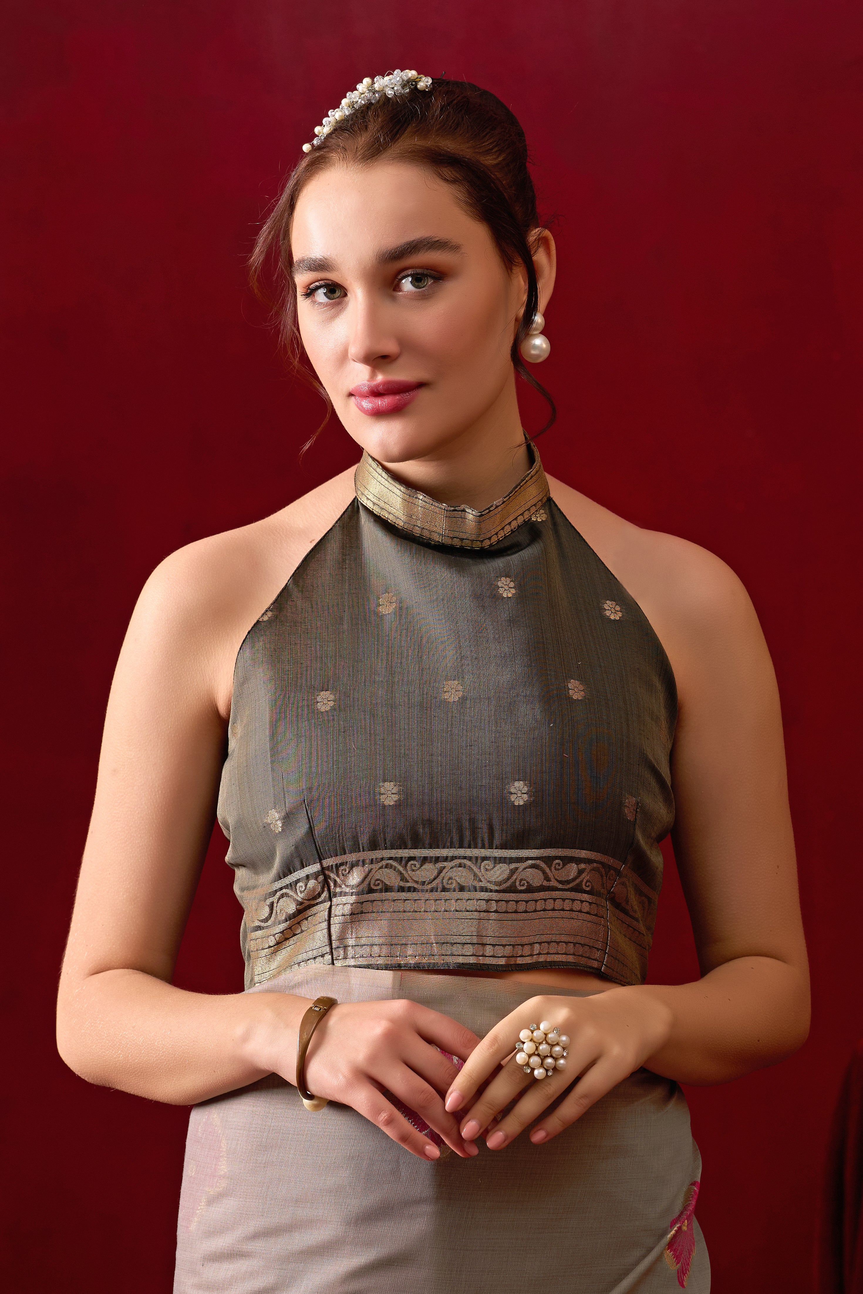 This saree beautifully blends elegance with charm through its delicate floral motifs that flow gracefully across the drape. The subtle sheen of the Muga Cotton fabric enhances its sophisticated appeal, making it perfect for both festive and formal occasions. Its lightweight texture ensures effortless draping, while the intricate detailing adds a touch of refined artistry. A timeless piece that radiates grace and understated glamour.