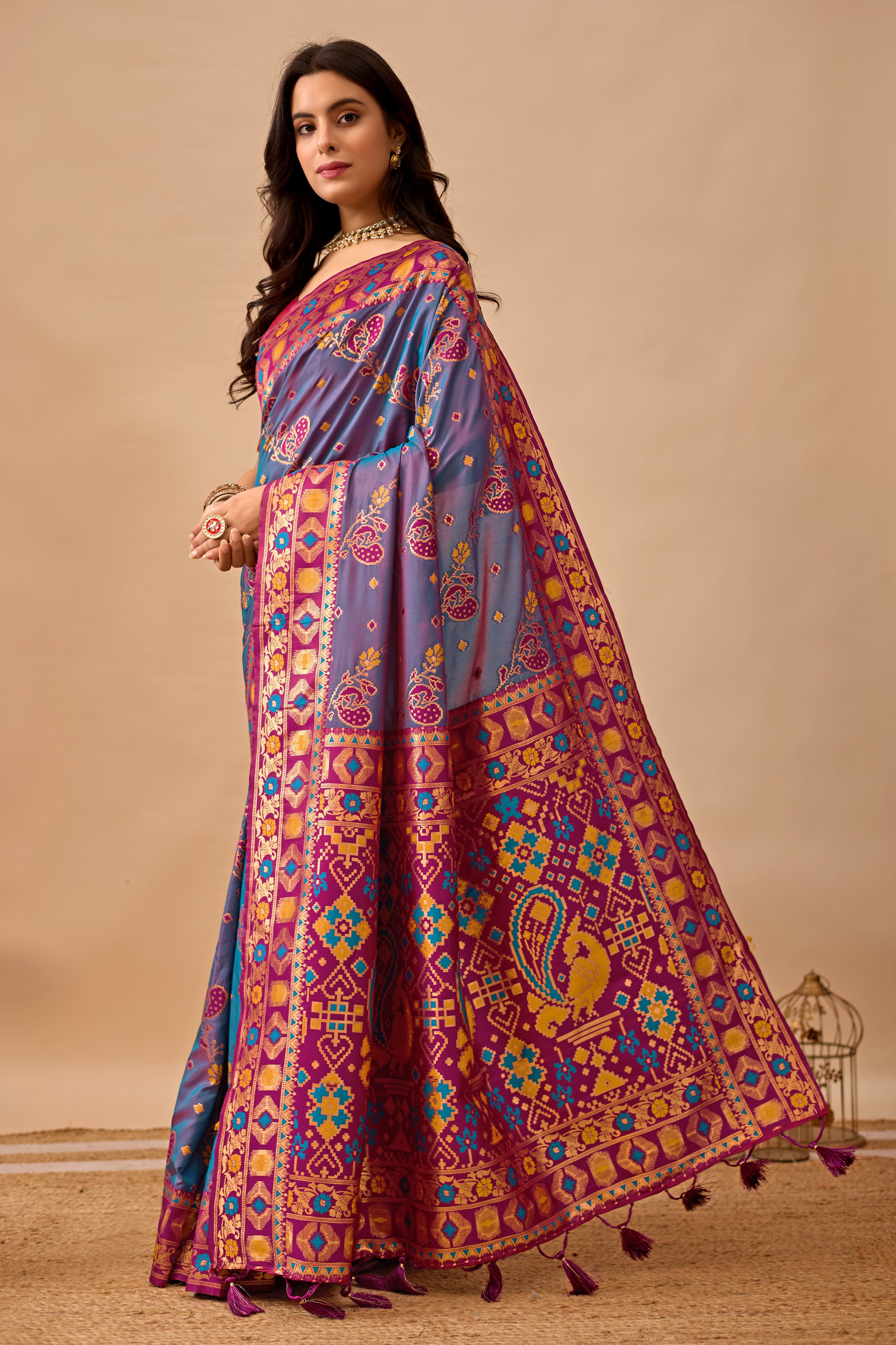• Rani Banarasi Silk Saree with Peacock Motifs & Firozi Contrast Pallu