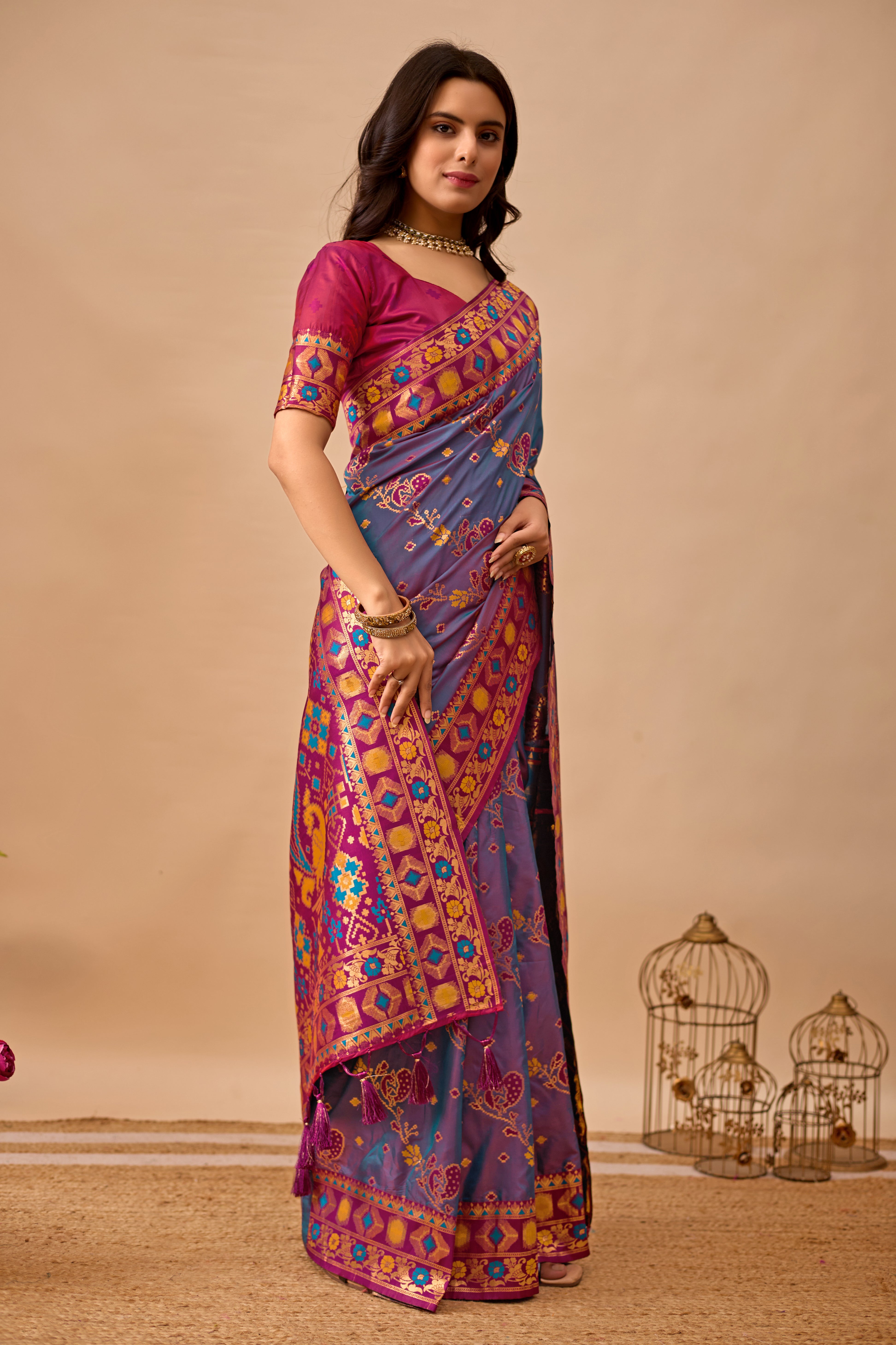 • Pink Banarasi Silk Saree with Peacock Motifs & Rama Contrast Pallu