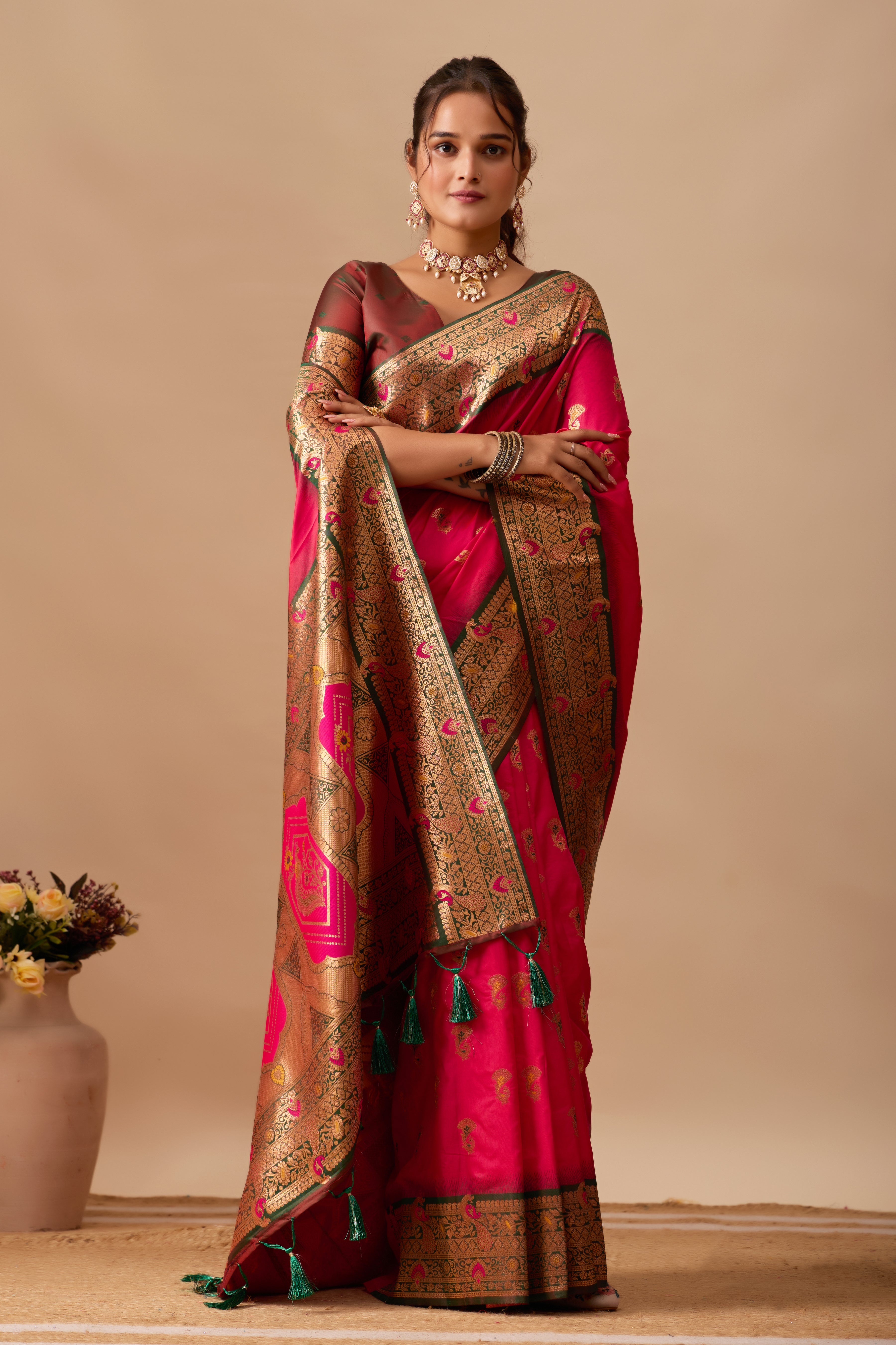 •    Color: Dark Rani Saree with Bottle Green Contrast Pallu & Blouse